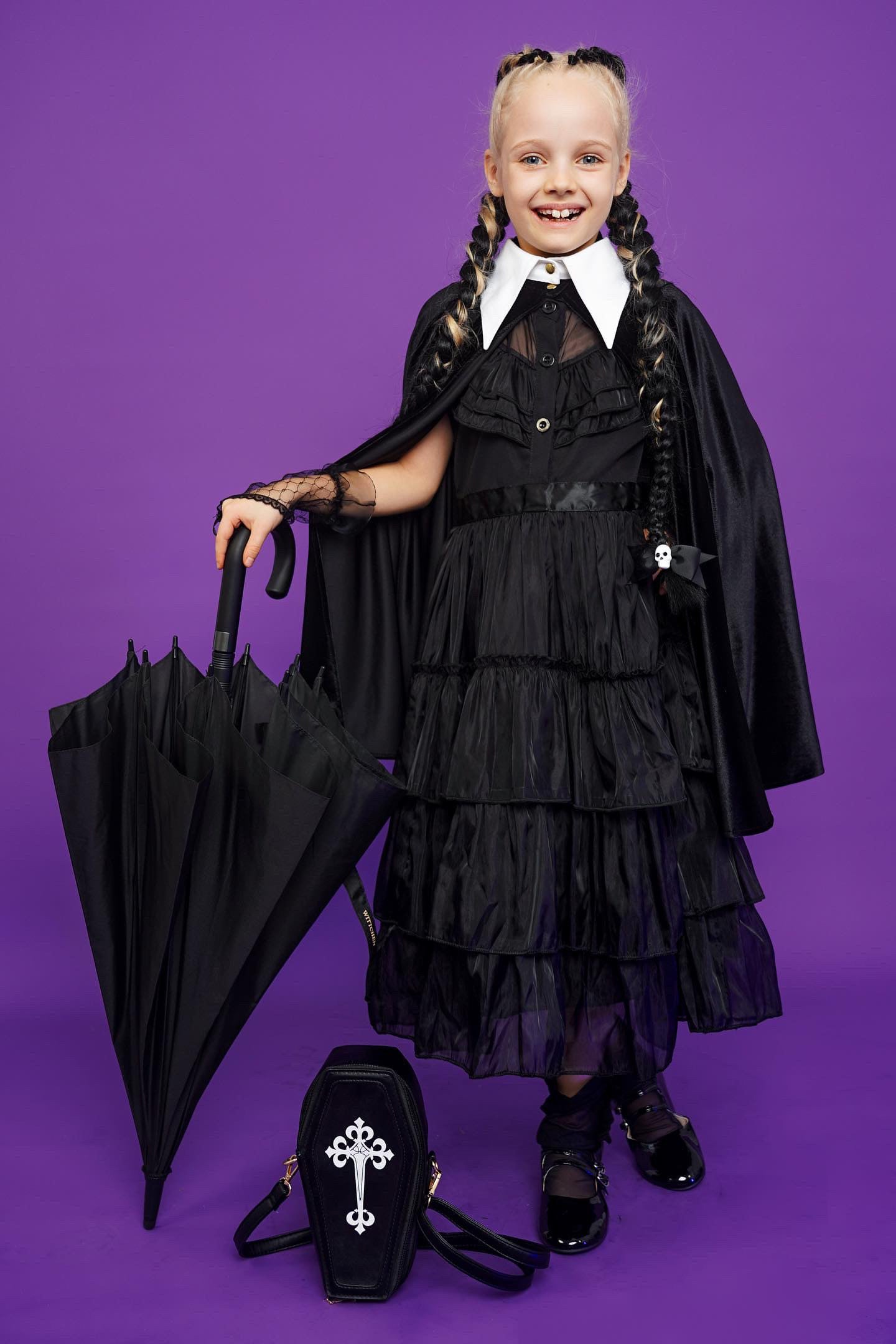 Ønsker dit barn at være klædt ud som den berømte Wednesday? Vores kappe er et fantastisk tilbehør til enhver lille prinsesse eller stor prinsesse, der leder efter det rigtige kostume til bal, Halloween eller karneval. Denne smukke kappe vil med sikkerhed tiltrække opmærksomhed og få dit barn til at føle sig som i et eventyr.