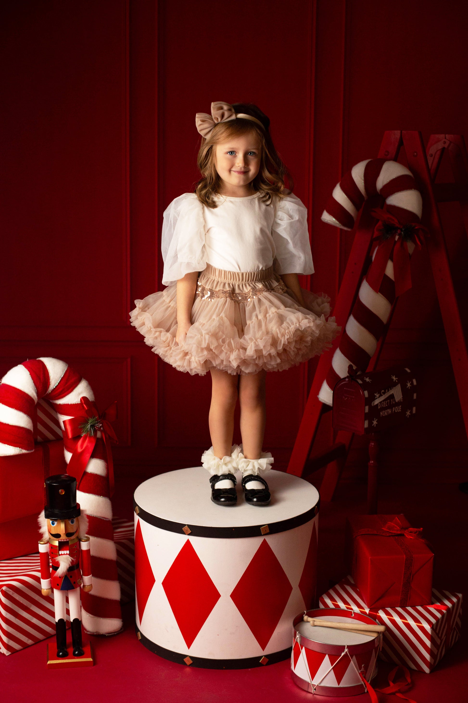 Hvis du leder efter det perfekte outfit til Halloween eller et magisk kostume, vil vores tyl nederdel med flæser med sikkerhed opfylde enhver piges drømme. Denne nederdel er fortryllende med sit lette og luftige design, prydet med skimrende pailletter og fløjlsdetaljer lavet af samme stof som vores kapper – sammen skaber de det perfekte kostumesæt!